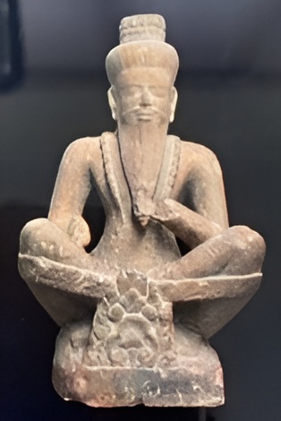 According to Khmer art experts, this statue is in the Preah Ko style of the 9th century, Angkorian period. The ascetic sits with his palms join together in the Sampeah gesture. His legs crossed each other and they tied together for support. Which is a typical method used by Brahmanic India Ascetic in Yoga exercises.