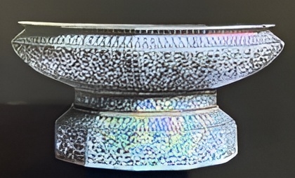 There are many items similar to this in the National Museum’s collection. They have different shapes, from four-sided, ten-sided or twelve-sided. Materials used for making this object include bamboo, rattan, palm fibers, and wood. Tiny shells or colored glass fragments can also be used to embed in the exterior as decorative elements. The function of this object is to place fruit or other offerings during ceremonies.