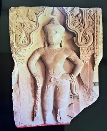It is a gentle Dvarapala carved in the frame with Naga decoration elements. His right hand holds a stick, while the left rests on the hip. The figure is richly decoration is a circlets, earrings, armband and bracelets. He wears a small pleated Sampot Chang Kben wrap under the belt. The front of this Dvarapala has sustained considerable damage.