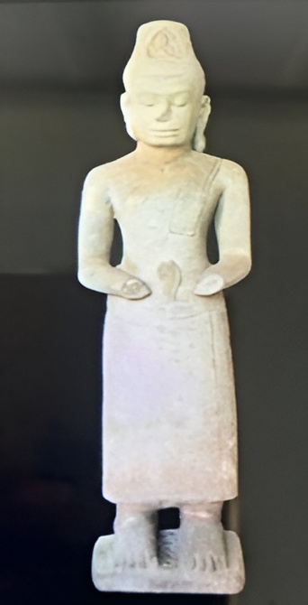 Unfortunately, in this case, it is missing. The forehead is carved with a figure of Amitabha. This statue appears unfinished. The legs are hug, and additionally supported and the body poste is rather stiff. Which is one the characteristic of sculptures carved during the reign of the King Jayavarman VII.