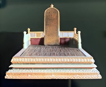 This royal sedan chair was the property of King Norodom, who donated it to the National Museum to add to its collection. It was made in the late 19th or early 20th century. There are three layers in the base structure of the platform and all are skillfully carved. The item at the center is a backrest which bear the royal insignia. The backrest is coated with lacquer and is removable. Ivory was used to decorate the armrests and the supporting frame for backrest.