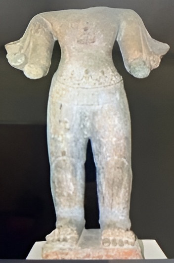 The head and all eight forearms are missing from the statue. The torso is large and has a carved Buddha image in the center of the chest and five other at the waistline. It wears Sampot Chang Kben that is tied under the belt, bearing moon flowers decoration. Both feet are large and flat. The toes also have carving Buddha images, which are typical of Bayon style statues.