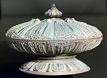 It could be made of wood or rattan coated in lacquer and embedded with beads, glass fragments, or other tiny objects as decoration. The object has three main components. This supporting pedestal the bowl or container and a cover, which has a handle that look like a lotus bud on top.